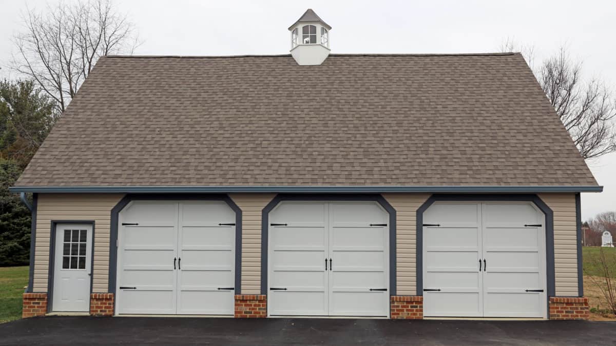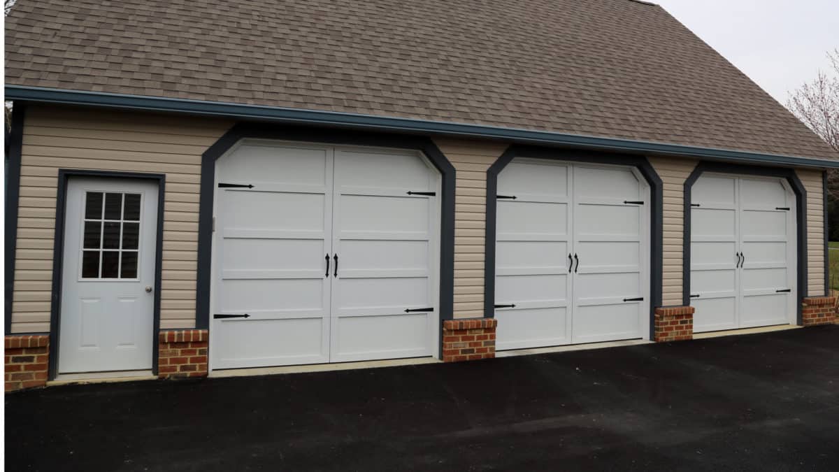 This detached garage features 3 beautiful 9′ x 8’6″ garage doors from the Overhead Door™ Courtyard Collection, model 161A. The insulated steel construction of Courtyard Garage Doors are tailored to resemble the beauty of elegant wood designs. These doors are 1 3/8″ thick and offer an excellent R-value of 12.76. This homeowner chose to accent the doors with decorative hardware, using spear handles & hinges.