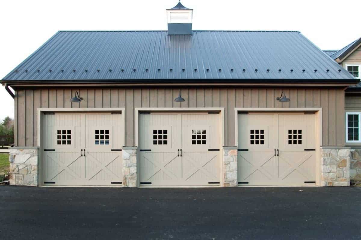 This detached garage features 3 custom-built garage doors from our Signature Carriage Collection. These doors are totally custom and can be made to match any desired envision. They are constructed from the finest wood and built with Amish craftsmanship. The heavy-duty hardware gives the appearance of a classic swing-open door. These doors are powered by our Odyssey® 1000 Belt Drive Openers that deliver the power needed at every movement of the garage door and continuously monitors the operation of the door ensuring safety.