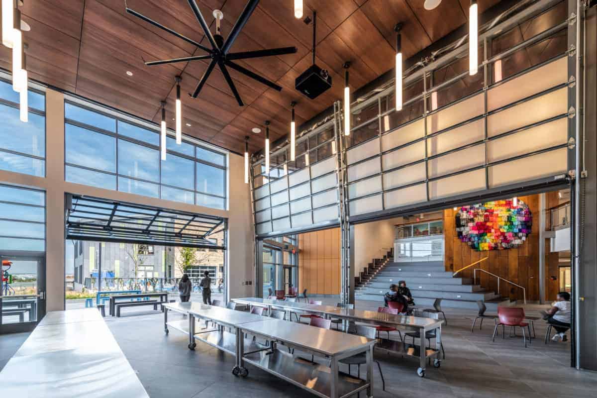 Martha’s Table at The Commons provides an array of functions under one roof. The trapezoidal gathering space at the center of the building features a Crown Hydraulically-Operated Bi-Fold Door and multiple Overhead Door™ aluminum sectional doors. It was important to create a space that fostered collaboration and acted as a hub. The bi-fold Crown Door opens to a courtyard, and the interior aluminum glass doors open allowing the spaces to be combined for community gatherings.