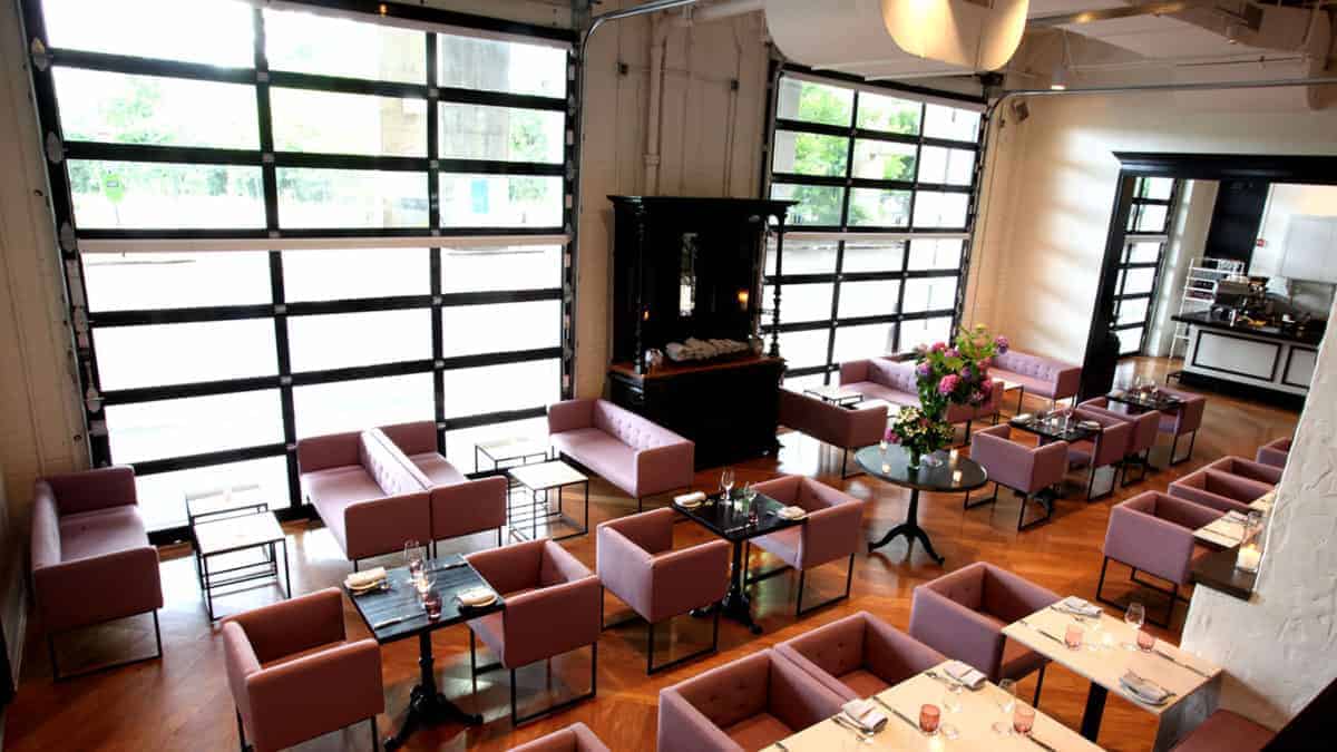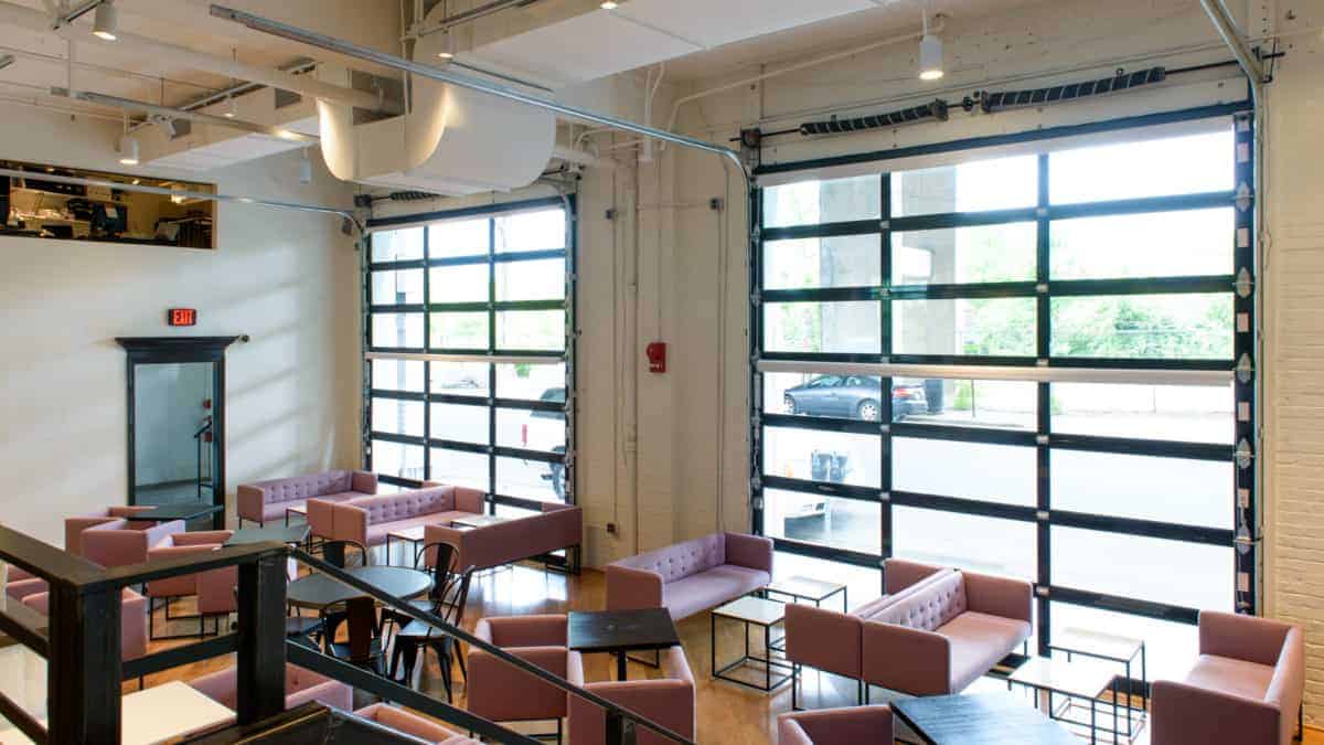 Malmaison in Georgetown, is a restaurant & event venue who incorporated our Aluminum Glass Garage Doors (Overhead Door™ 521 Series). This series is appropriate for environments where maximum light and/or visual access is wanted or needed. These doors are sleek, attractive and functional! They are engineered for long life, low maintenance and are practical and durable. When the doors are up, restaurant visitors can take pleasure in the feel of being outside on the patio, and in the winter they can enjoy the beauty of the snow, but the warmth of the indoors.