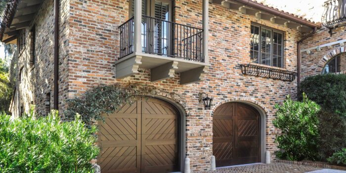 This custom home features beautiful Overhead Door™ Signature Carriage House Doors. These doors combine the classic swing-open appearance with the convenience of standard sectional garage doors. For the homeowners convenience, quiet Destiny® 1200 Belt Drive Openers were installed with a wireless keypad on the outside. These wood garage doors are available in several wood species as well as numerous stain & paint grades. The panels and glass sections can be customized to virtually any design. The decorative hardware on these doors offered the perfect finishing touch.